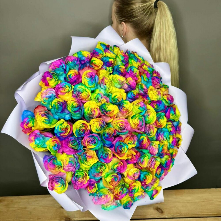 На фото букет из 101 радужной розы. В составе: роза 101 шт, дизайнерская упаковка 3 шт, атласная лента 3 шт, . Все цветы свежие и ароматные, букет красиво оформлен и отлично подходит для подарка. Доступна доставка цветов или самовывоз.