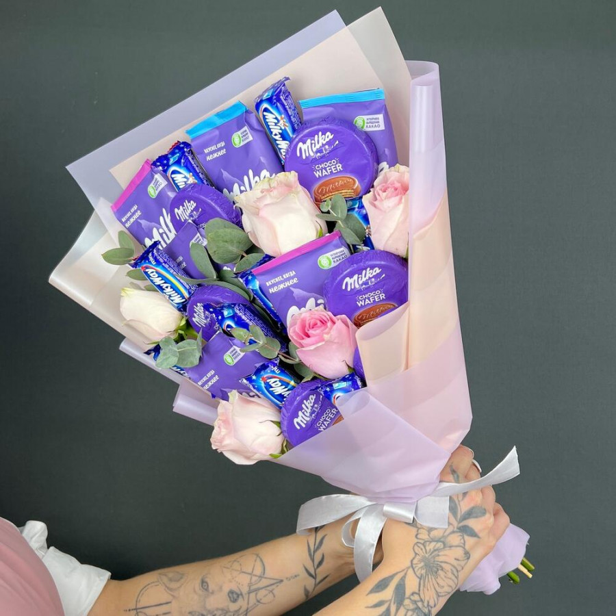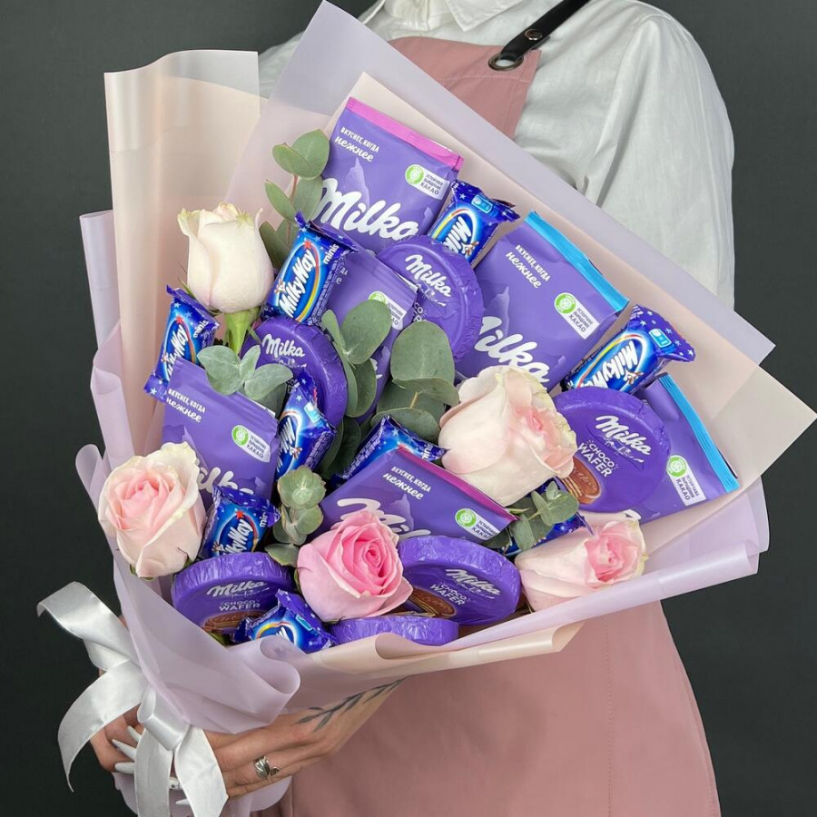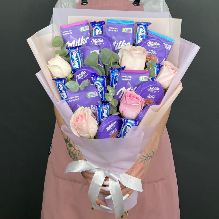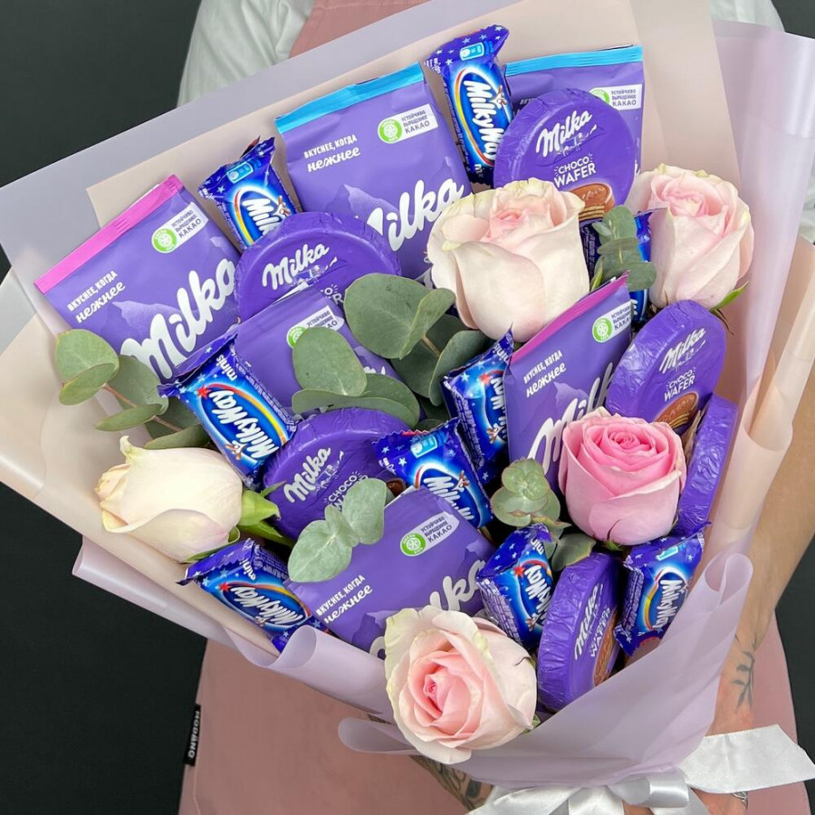 Букет из конфет Milka и розовые розы в Орехово-Зуево