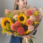 На фото букет из подсолнухов и георгин. В составе: георгина 5 шт, подсолнух 3 шт, солидаго 5 шт, гвоздика 3 шт, дизайнерская упаковка 1 шт, атласная лента 1 шт, . Все цветы свежие и ароматные, букет красиво оформлен и отлично подходит для подарка. Доступна доставка цветов или самовывоз.